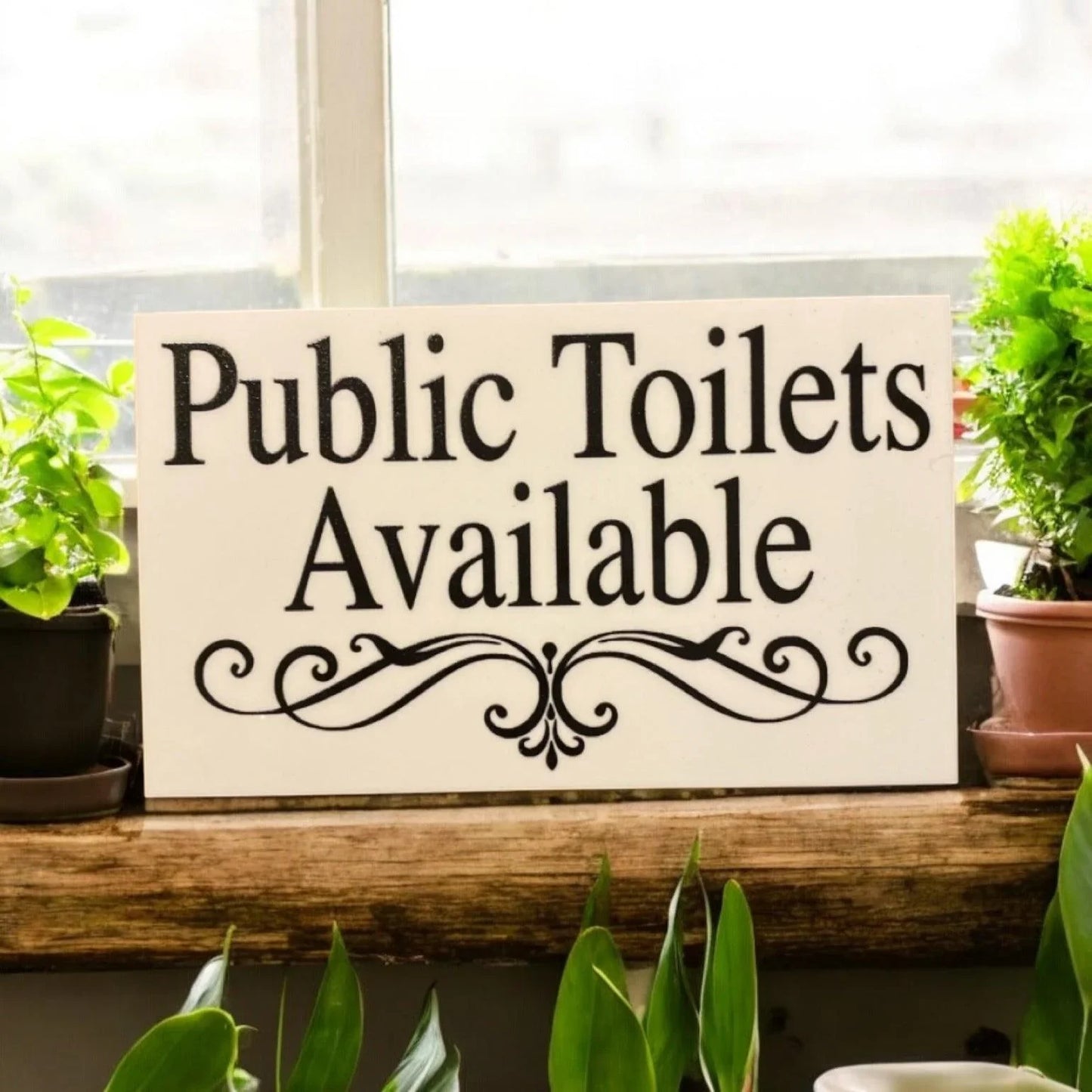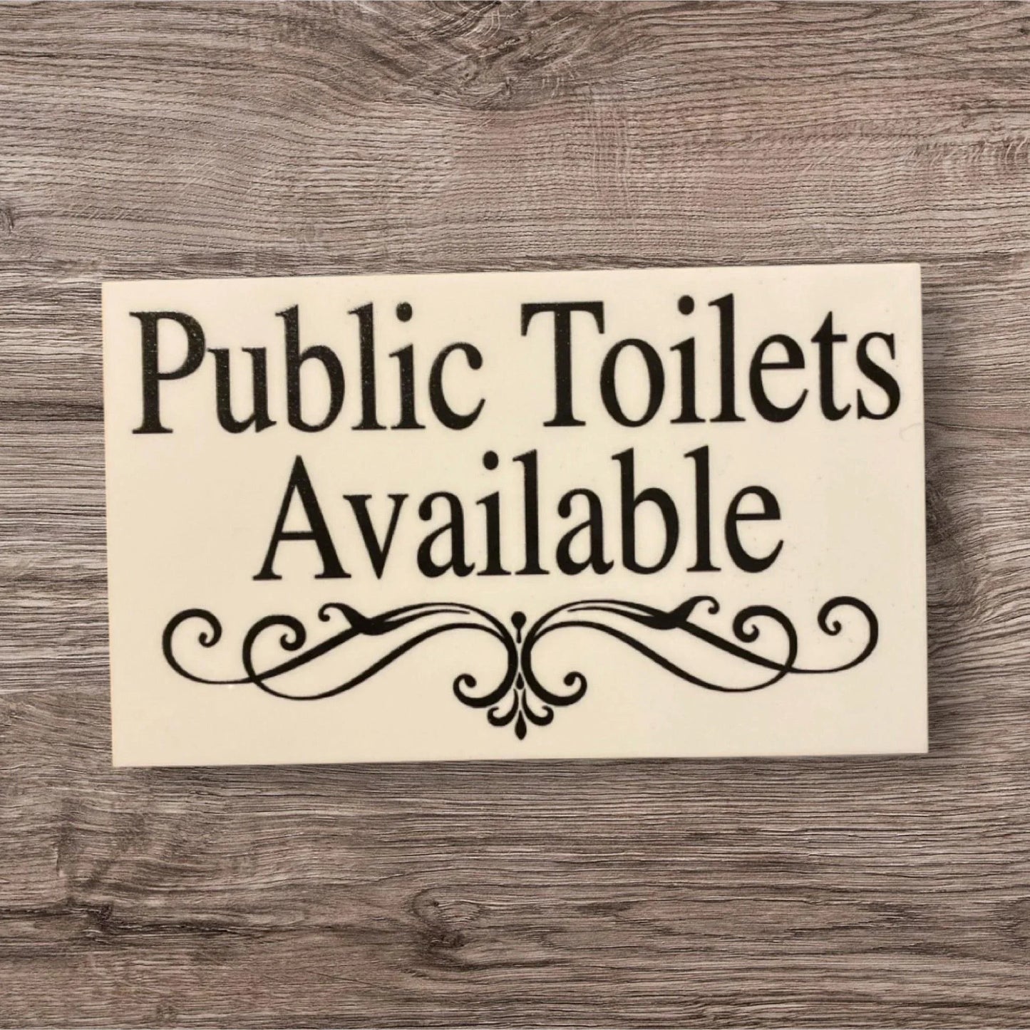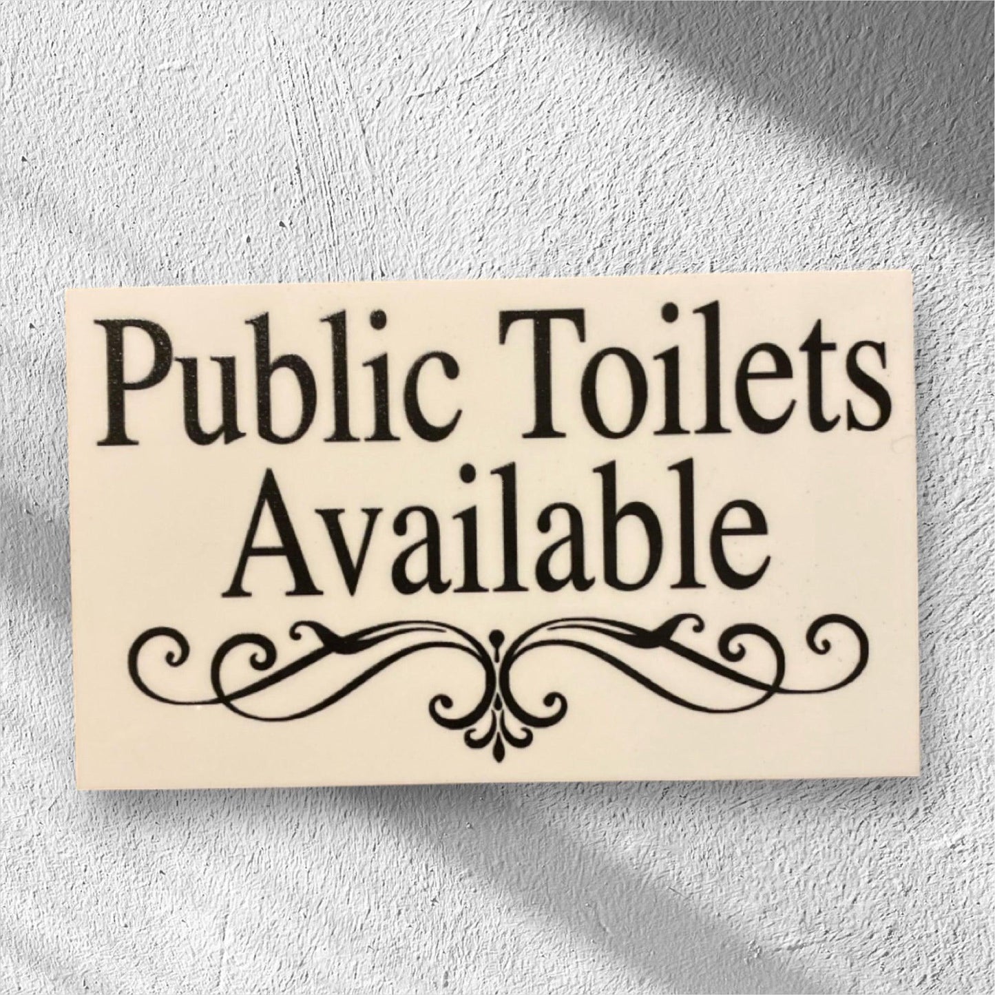 Public Toilets Available Toilet Restroom Wall Sign Transform any public space into a welcoming environment with the addition of this toilet sign! Your guests will feel at ease and comfortable knowing that there are clean and accessible restrooms nearby. Say goodbye to any unnecessary stress or discomfort – this sign has got you covered.