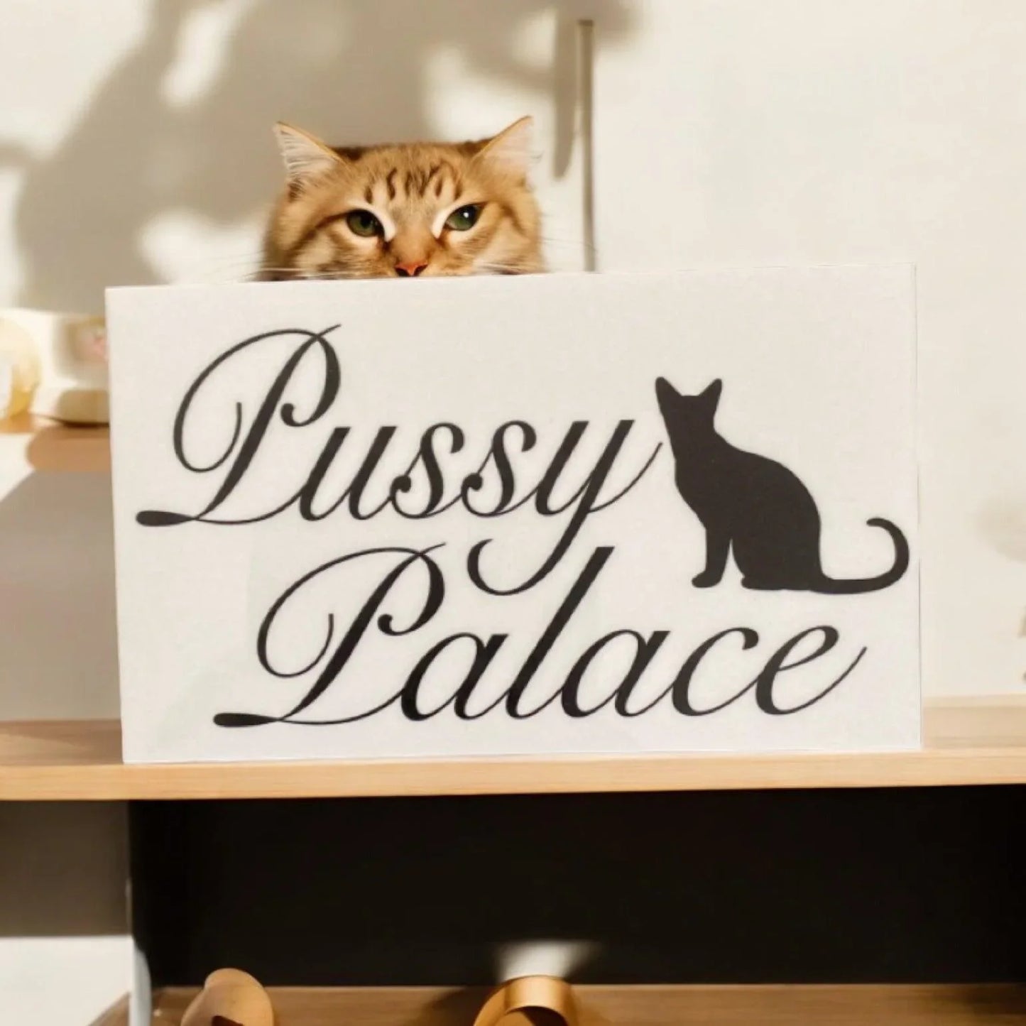 Pussy Palace Cat Kitty House Sign Transform your home into a feline paradise with the Pussy Palace Cat Kitty House Sign! Your furry friends will feel like royalty with this whimsical addition to your decor. Give your cats the ultimate throne room and watch them rule in style (don't worry, they'll still love you fur-ever).