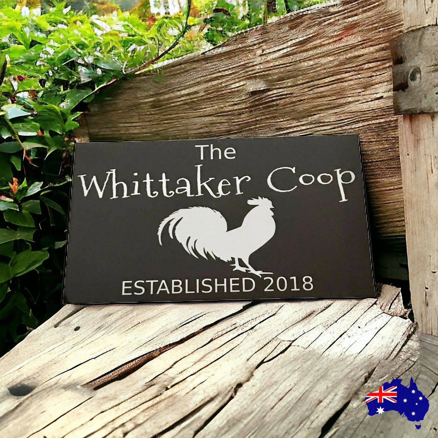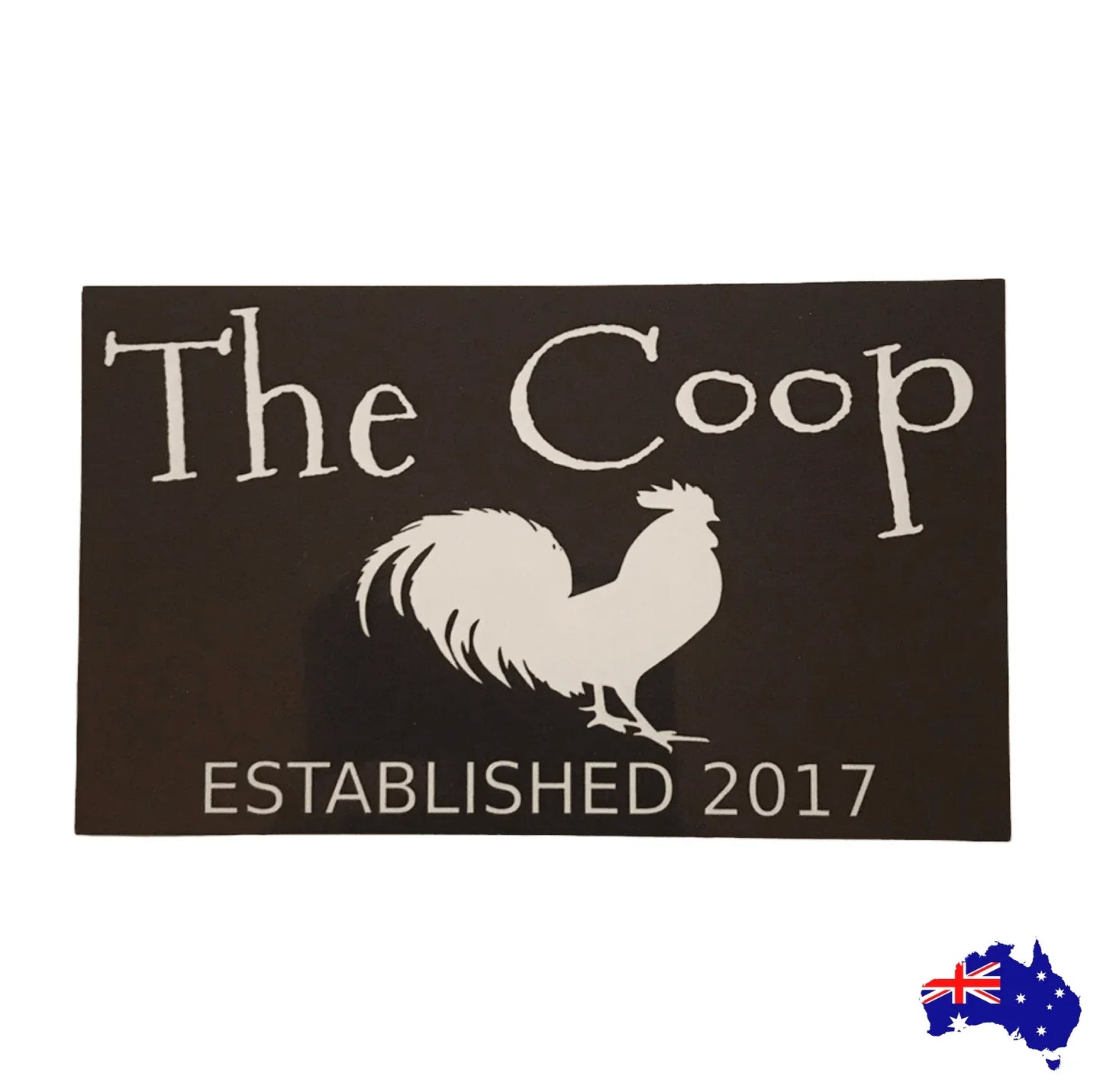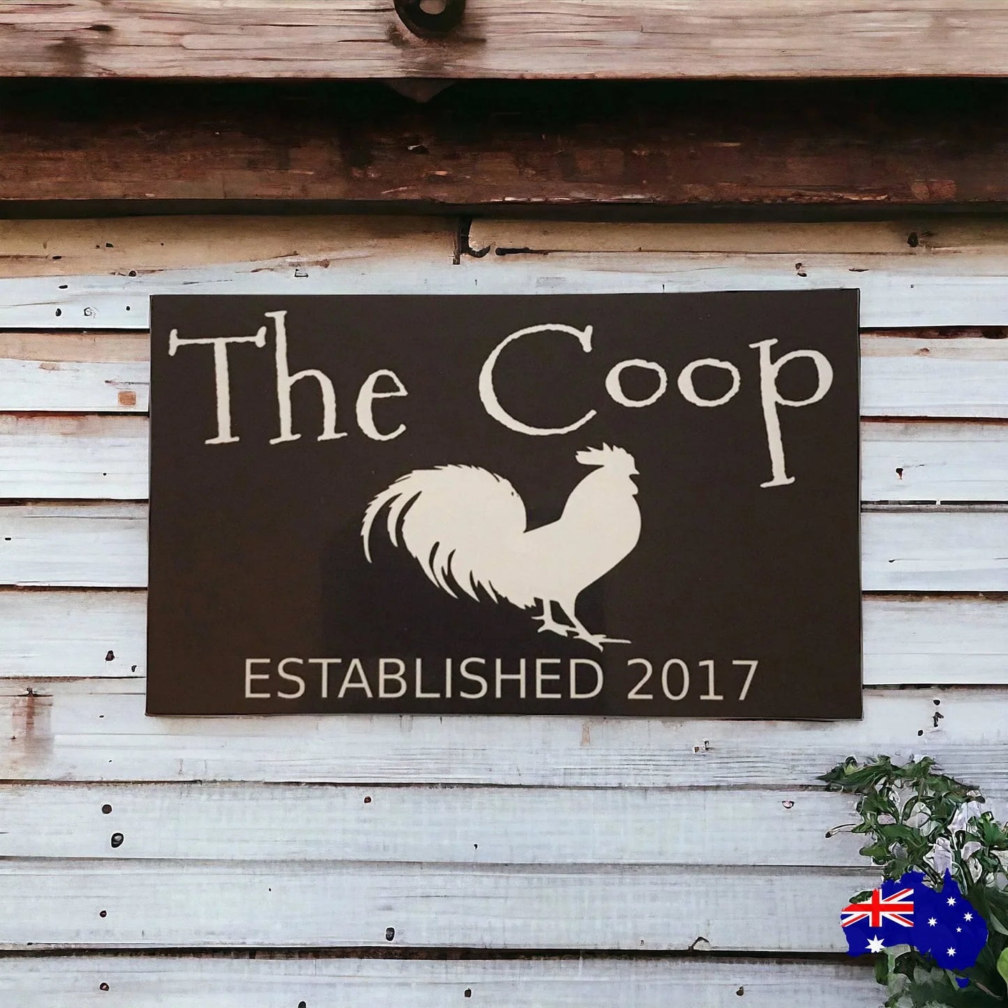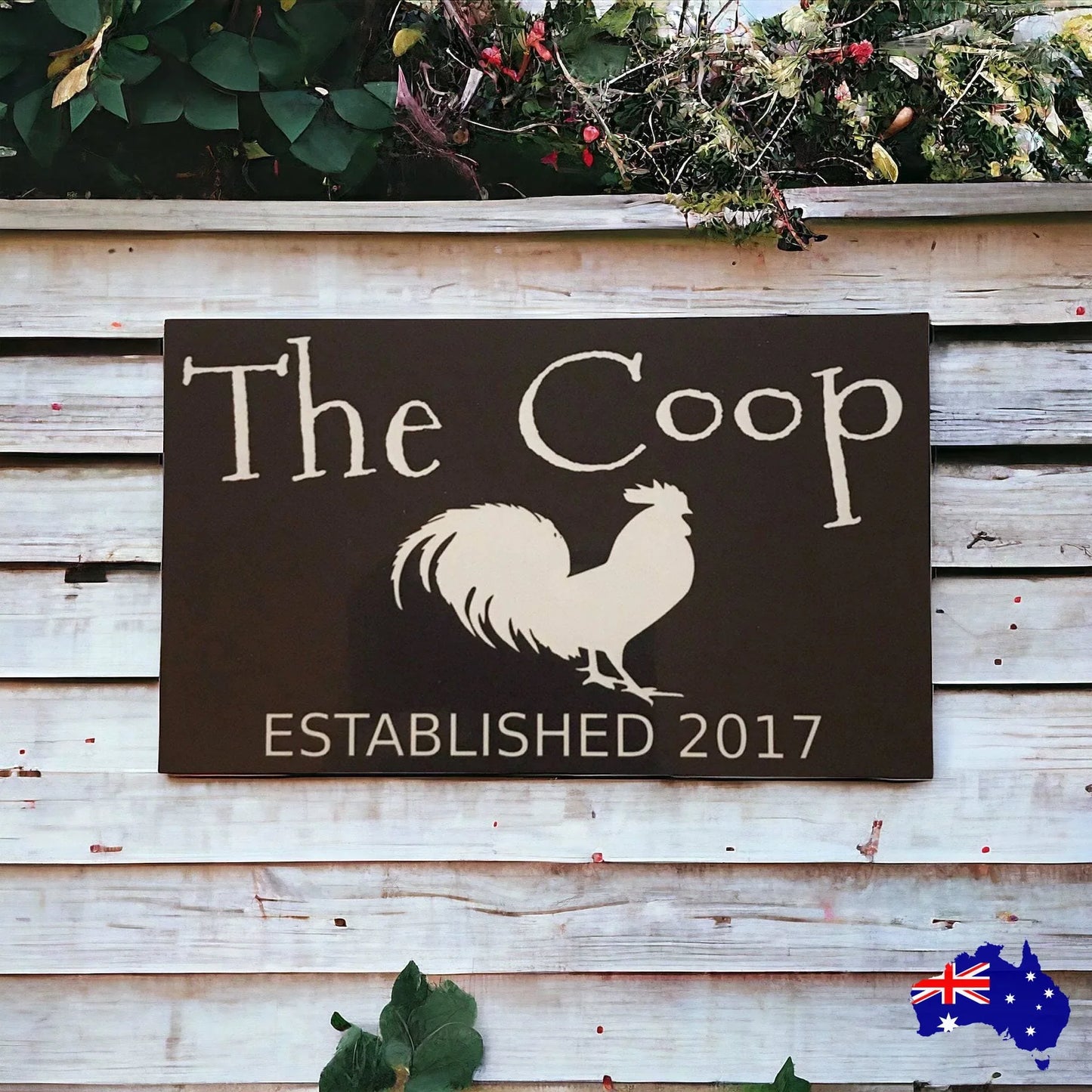 Enhance your backyard coop with Rooster Chicken The Coop Personalised Custom Sign. Make it unique by adding your family name, or choice of wording and the year you started raising chickens.