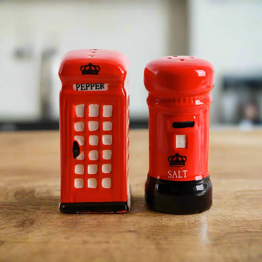 Experience the charm and nostalgia of this set of 2 Salt Pepper Shaker London UK Telephone Booth Postbox ceramic salt and pepper shakers will add a stylish touch to any home dinner table, cafe or restaurant. Add a touch of uk english london style to your dining table with this wonderful Salt & Pepper Shaker Set. Makes a wonderful wedding feature or gift! Approximate Size of 8.9cm Tall x 3.9cm Wide