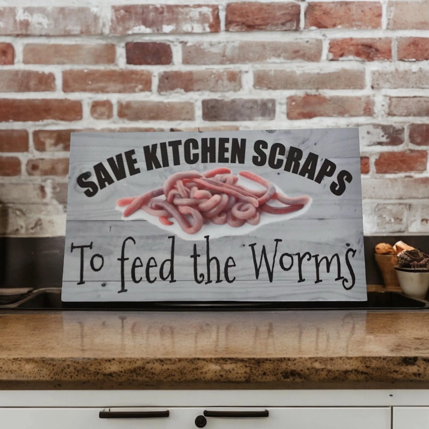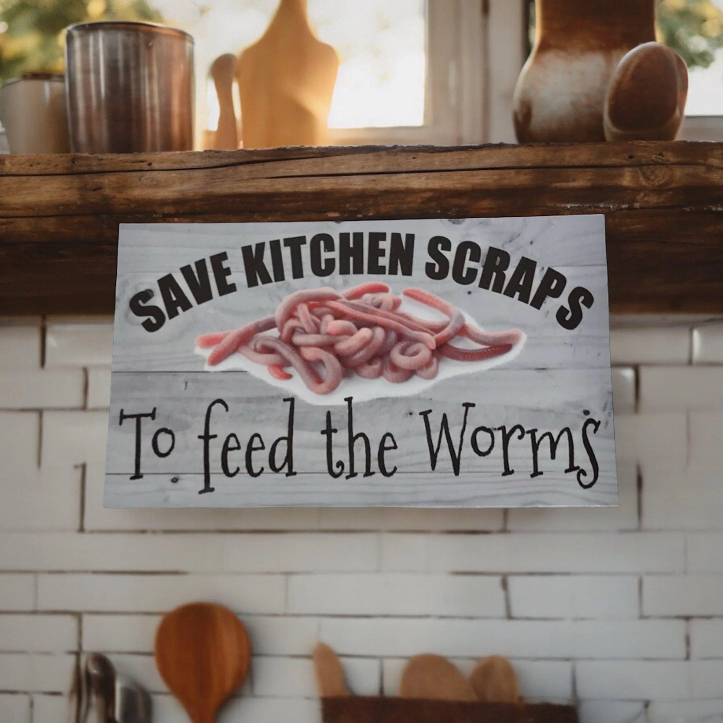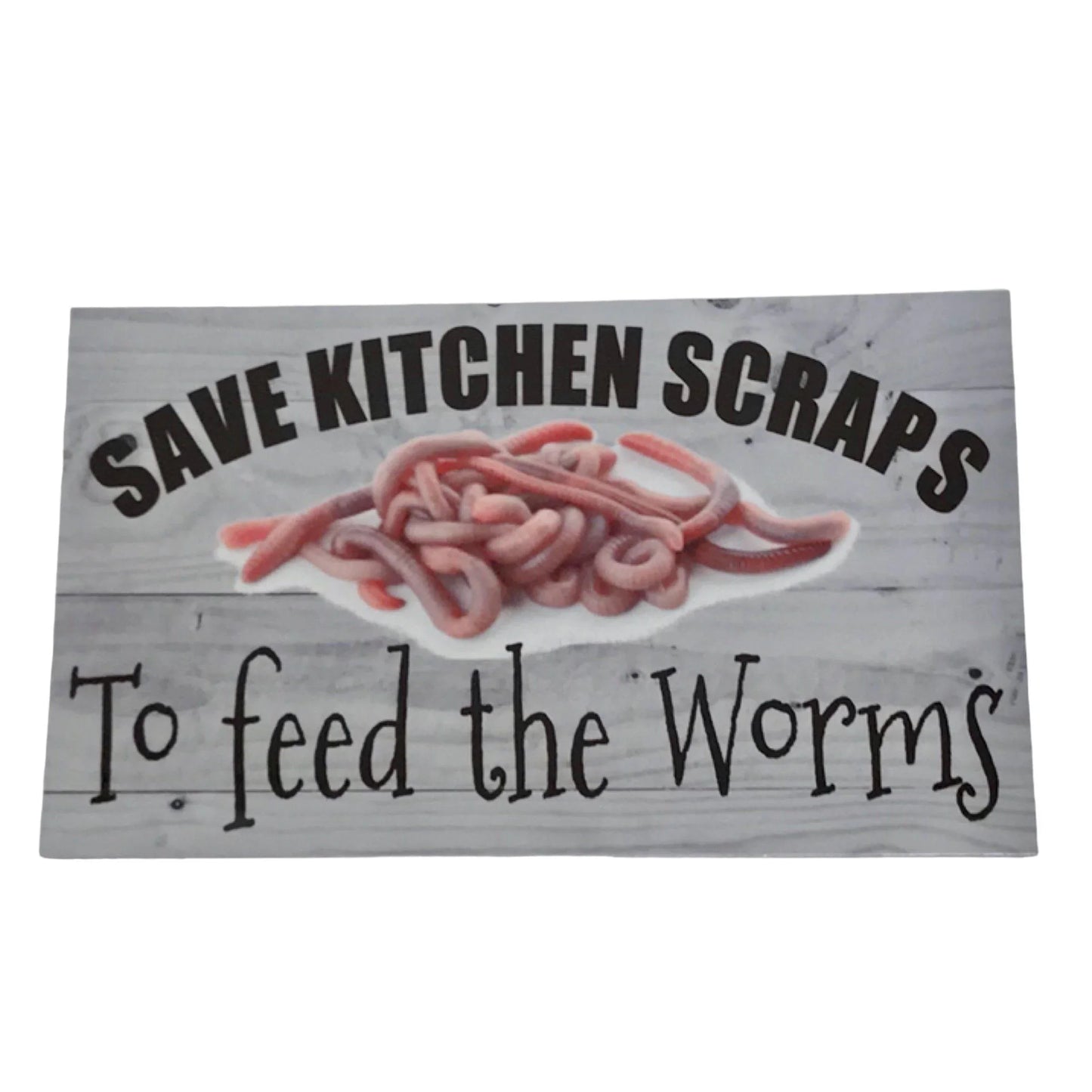 Don't be wasteful - feed worms with kitchen scraps! Get our Aussie made sign for your kitchen bench to remind everyone to keep the kitchen scraps.