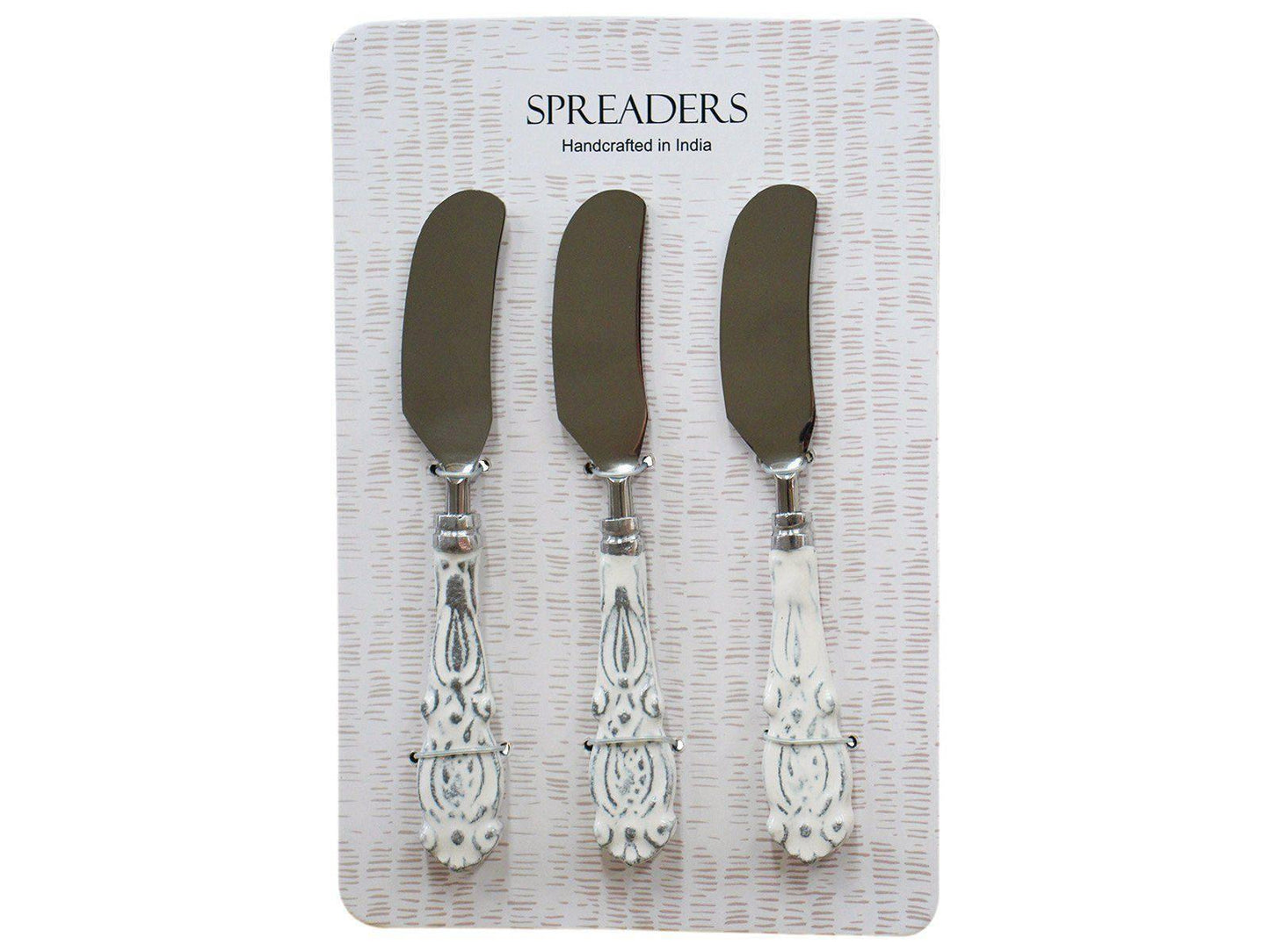This elegant set of three vintage silver white wash rustic finish spreader knives perfectly complements dining settings inspired by Vintage, Country, French Provincial, Shabby Chic, Hampton's, or Coastal Beach House styles. Add a touch of timeless charm to your table with these beautifully crafted spreaders.