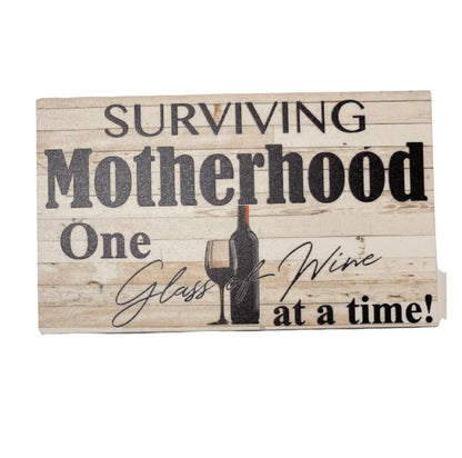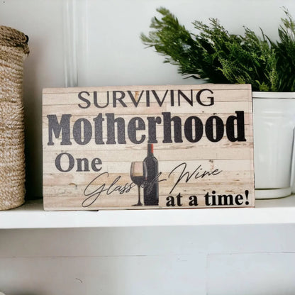 Celebrate the joys and struggles of motherhood with this charming "Surviving Motherhood" wine sign. Perfect for any mum, this sign is a reminder to take a break and enjoy a glass of wine while navigating the ups and downs of parenting. A fun and relatable addition to any kitchen or home bar!
