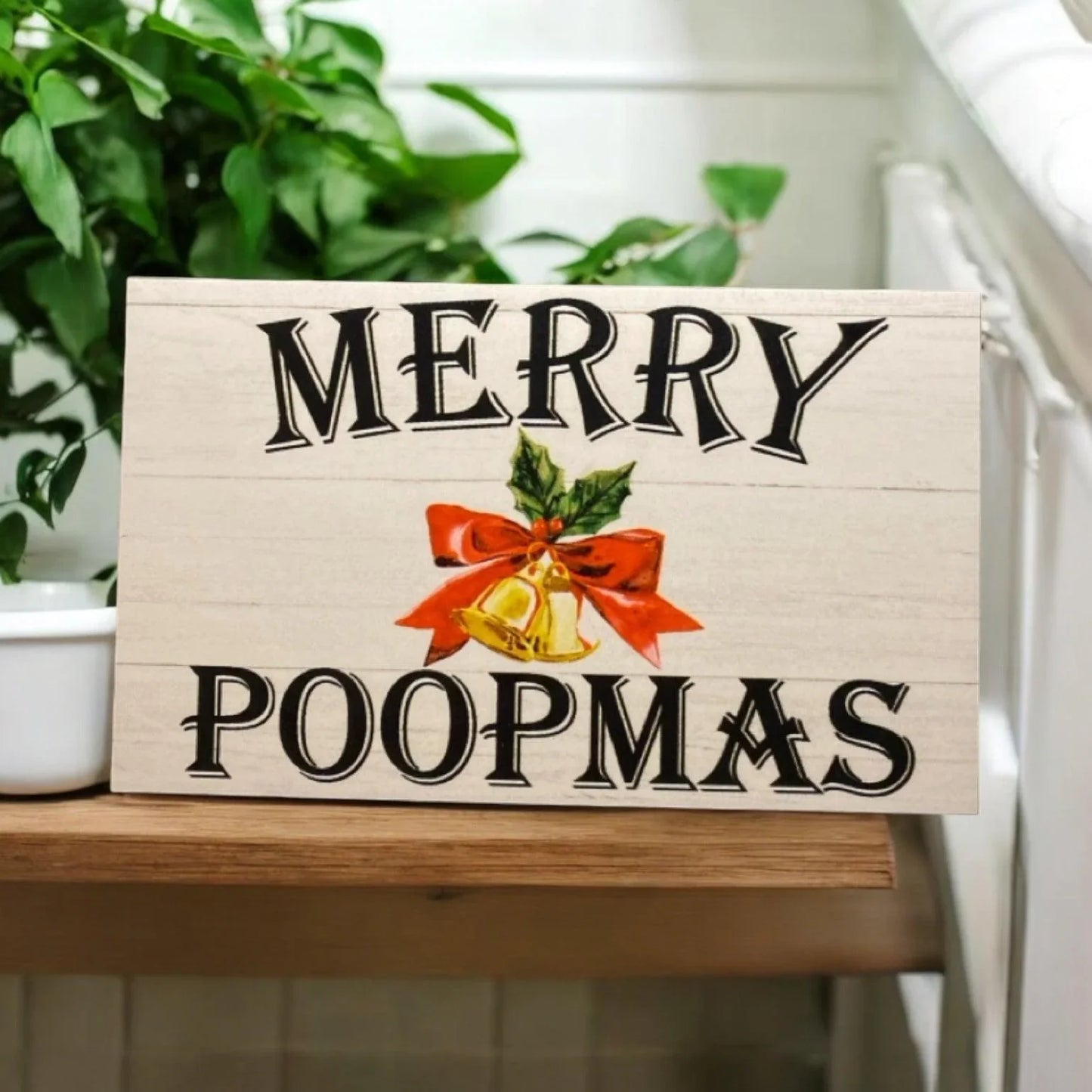 Toilet Christmas Merry Poopmas Funny Sign "Add some festive humor to your holiday décor with our Toilet Christmas Merry Poopmas Funny Sign. Spread holiday cheer and laughter with this clever and unique addition to your home. Perfect for parties or as a fun gift, this sign is sure to bring a smile to anyone's face. Get in the holiday spirit with this one-of-a-kind product!"