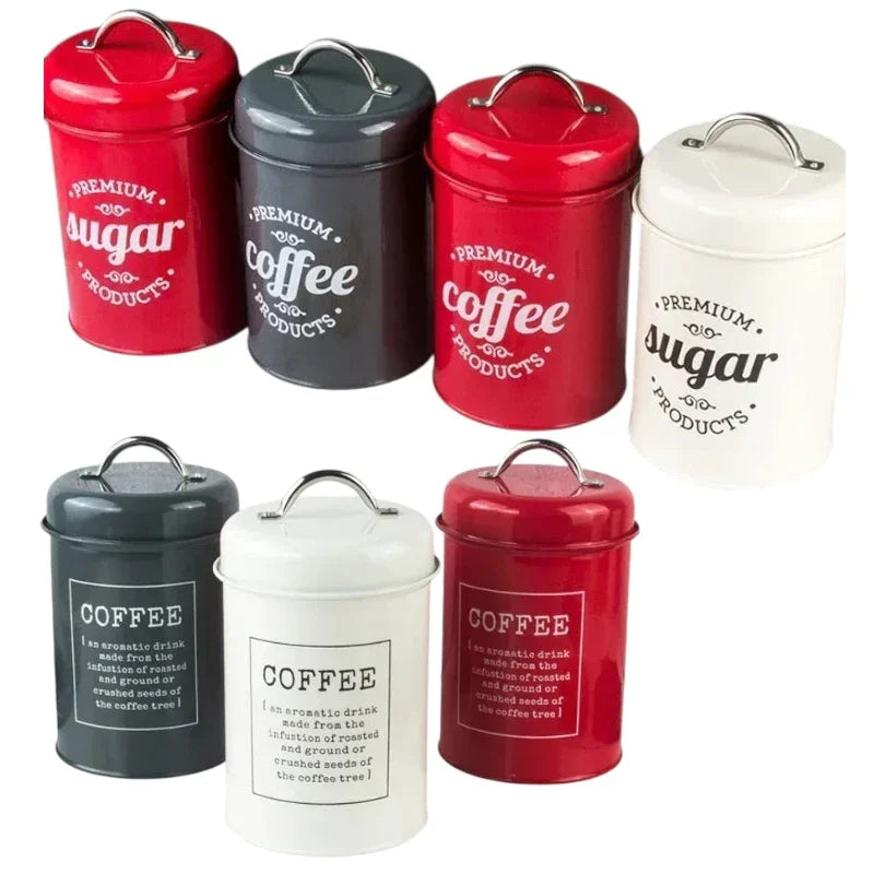 Lovely metal tins and holds a good amount of tea bags. The coffee tin fits a 10 packet of coffee sachets comfortably and tall enough to keep a small pair of scissors inside to cut off the tops of sachets - very convenient having scissors inside the tin. Has a secure lid with seal so it keeps product fresh. Very happy with these bench canisters as they are a perfect size and not overtaking my bench, but large enough to hold good supply of product for everyday use.