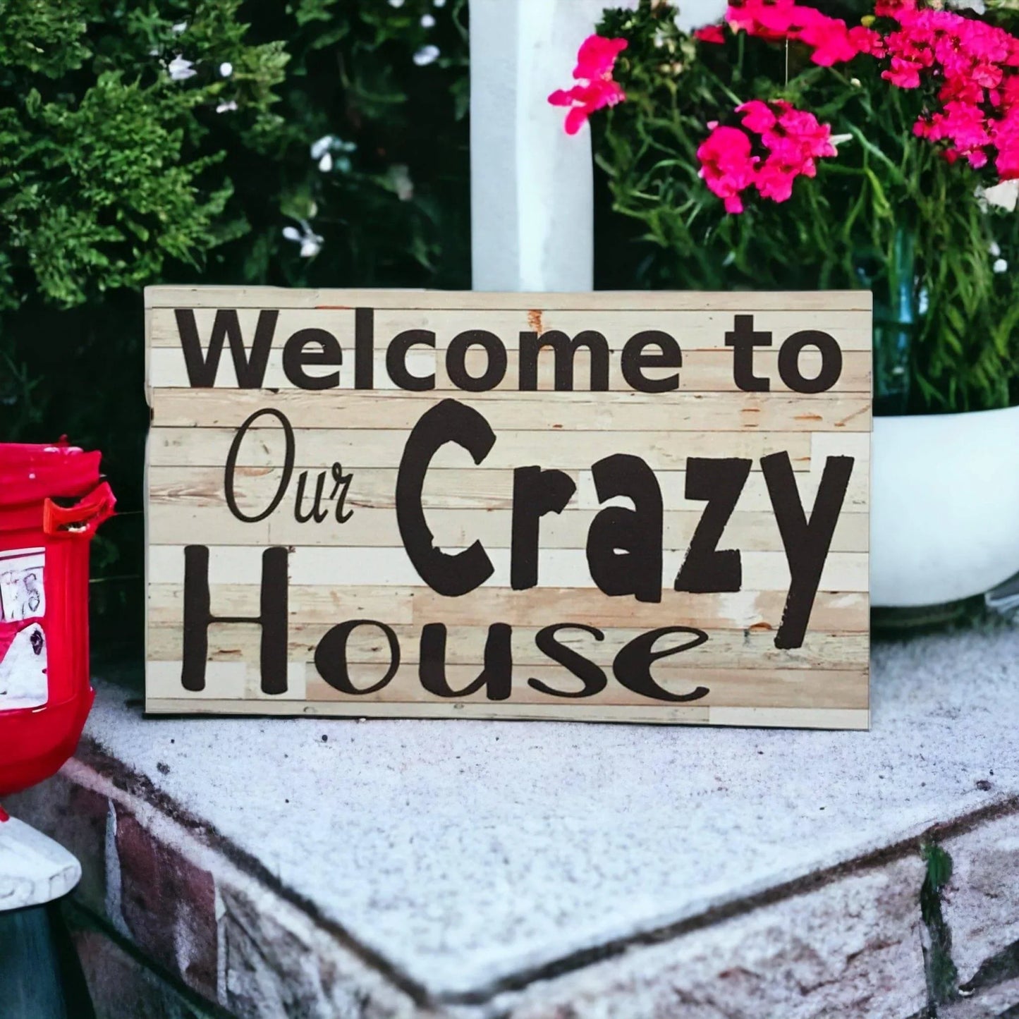 Welcome To Our Crazy House Sign This bold and playful sign will bring life and personality to your home. It's a perfect reminder that your family is proud to be a little bit different!