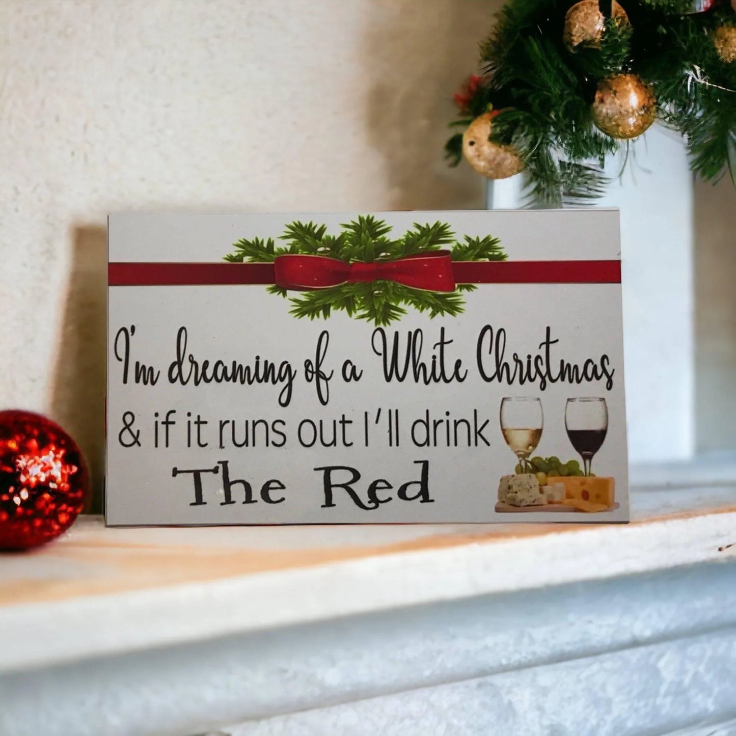 Indulge in the festive spirit with this White Christmas Wine Sign. Whether for your own home or to give as a gift to a wine lover in your family or circle of friends, this sign is the perfect addition to any holiday celebration. Don't be left without a glass of wine - this sign will remind you to enjoy the holiday season to the fullest! I'm dreaming of a white christmas and if it runs out i'll drink the red sign